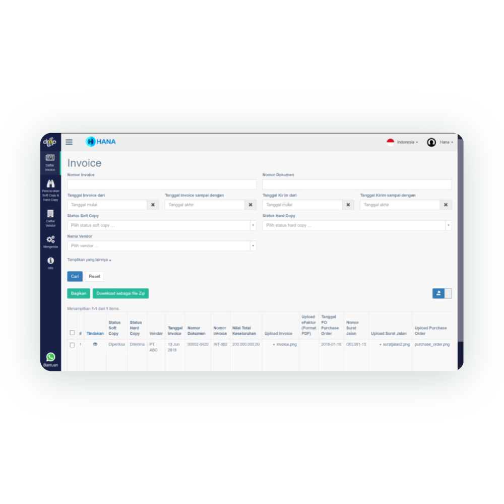 Filter options enable swift searches. Even physical documents can be matched effortlessly through QR code scanning of upload receipts or efficient manual matching.